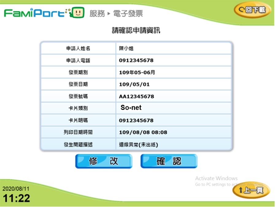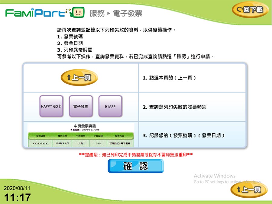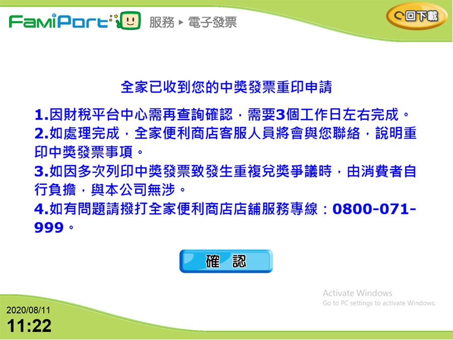 11. 完成重印申請,全家便利商店客服人員會在 3 個工作日和您聯繫重印中獎發票事項。