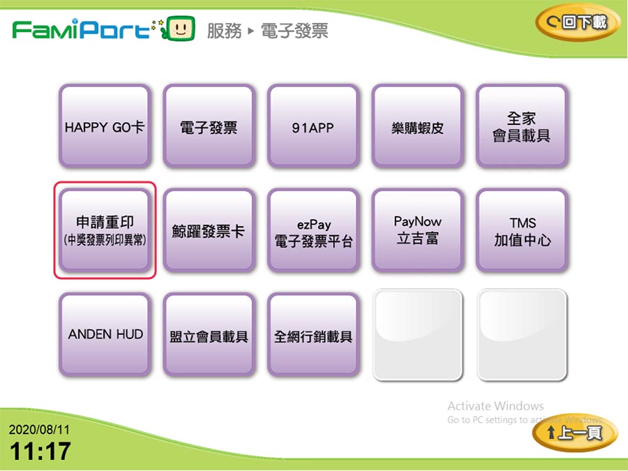1. 至 Famiport 機台,首頁點選:列印查詢 > 電子發票。