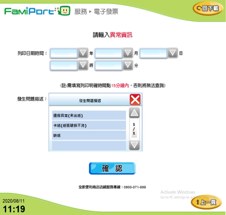 6. 輸入列印日期時間及發生問題描述,並按下確認。