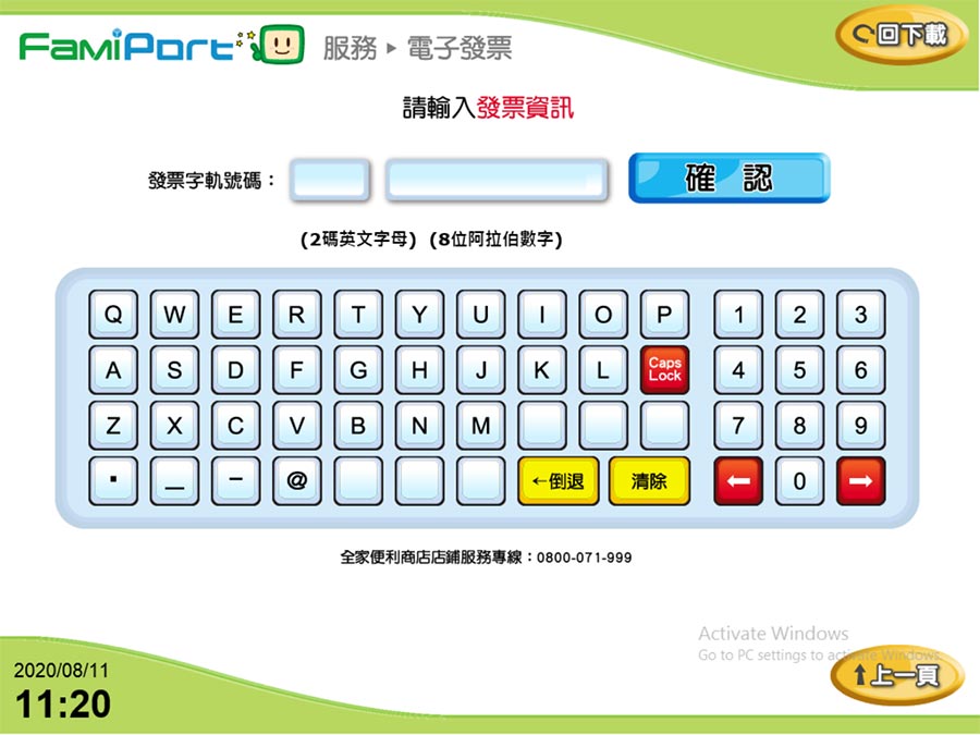 7. 輸入發票字軌號碼(英文 2 碼+數字 8 碼),並按下確認。