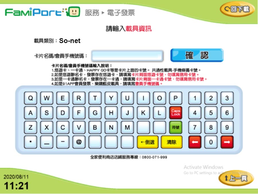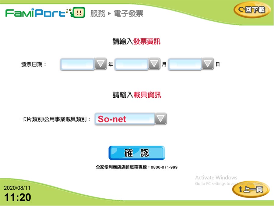 8. 輸入發票日期及載具資訊:So-net ,並按下確認。